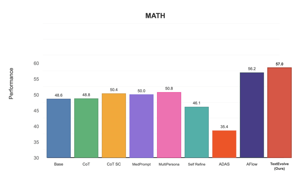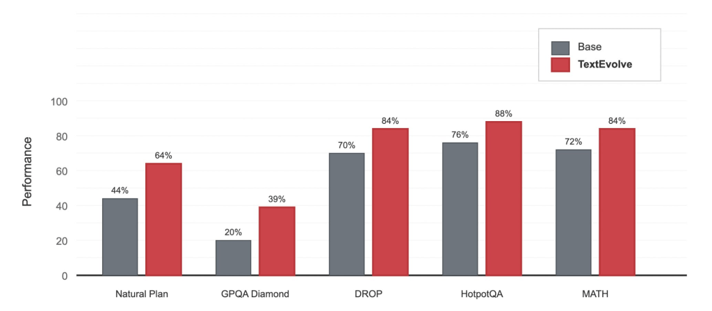 Initial results are very strong! TextEvolve produces programs that outperform the base model and SoTA methods across a wide range of domains:
